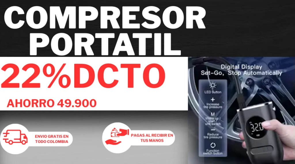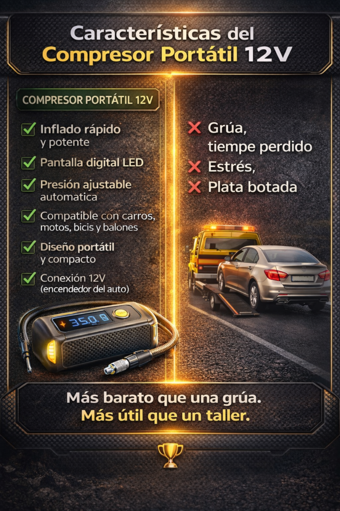 Infla tu llanta en minutos sin grúa ni despinchadero. Este compresor portátil te saca de la emergencia estés donde estés.