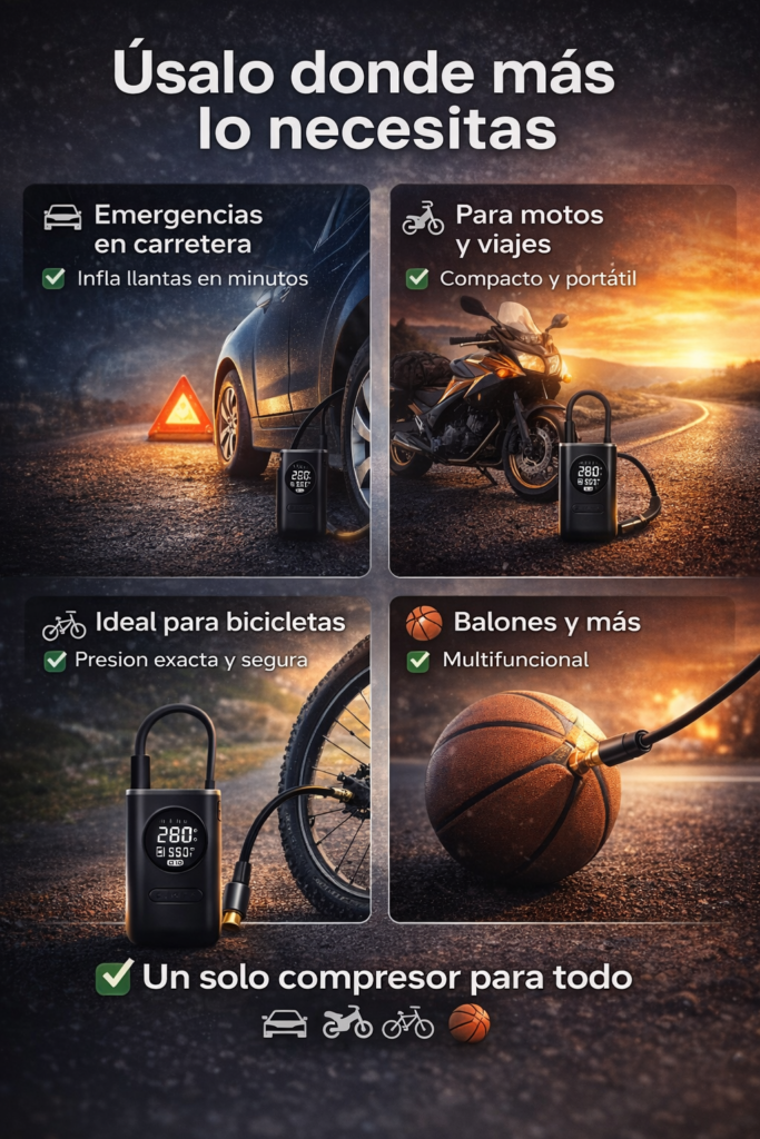 ✅ Sí. Es compatible con carros, motos, bicicletas y balones gracias a sus boquillas incluidas.