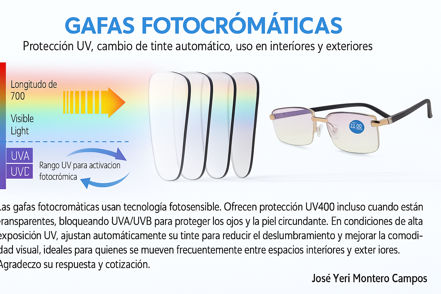 Las lentes fotocromáticas contienen moléculas fotosensibles que reaccionan al UV (luz solar). Al exponerse al sol se oscurecen para reducir el deslumbramiento; al entrar a interiores vuelven a su tono claro.
