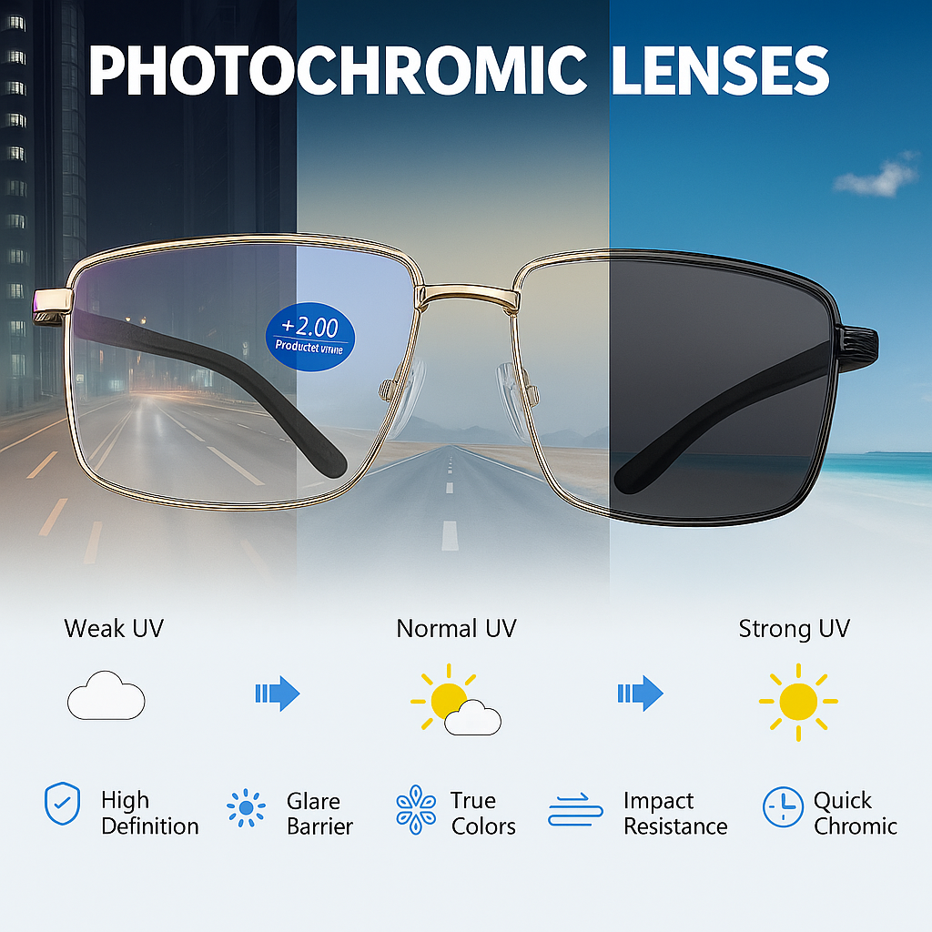 Estas gafas fotocromáticas se adaptan automáticamente a la luz, bloquean los rayos UV400 y eliminan los reflejos molestos, dándote visión nítida y sin fatiga visual. Su marco TR90 ultraligero y a prueba de roturas garantiza comodidad y resistencia en cualquier entorno.